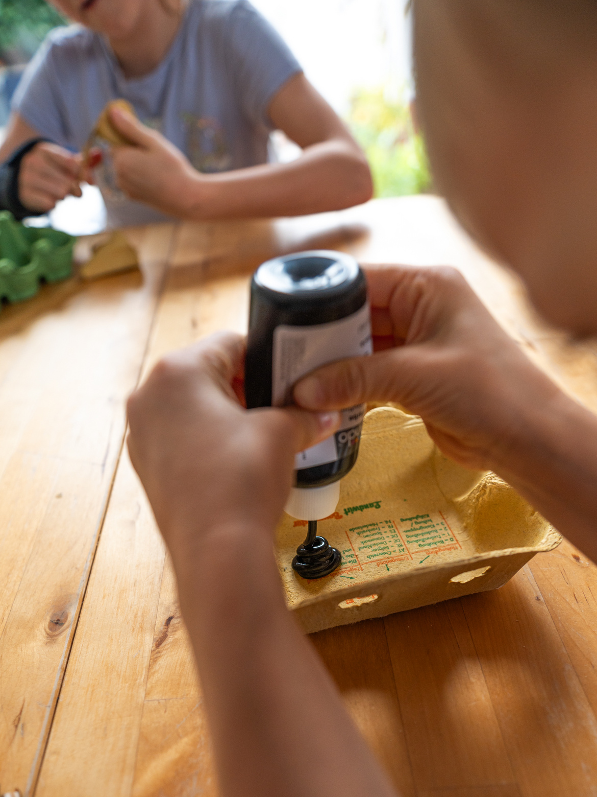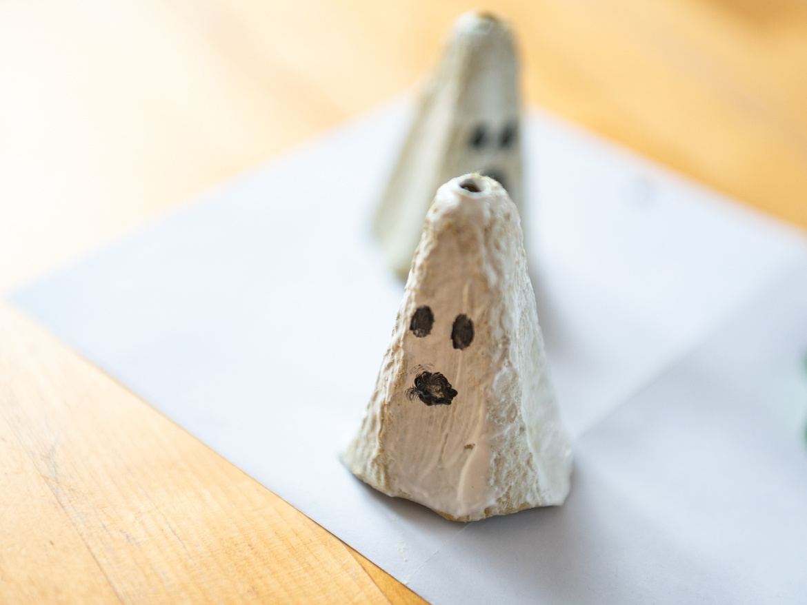 - Für die Gespenster einfach die Kartonmulden weiß anmalen, trocknen lassen und mit einem schwarzen Stift Gesichter aufmalen.