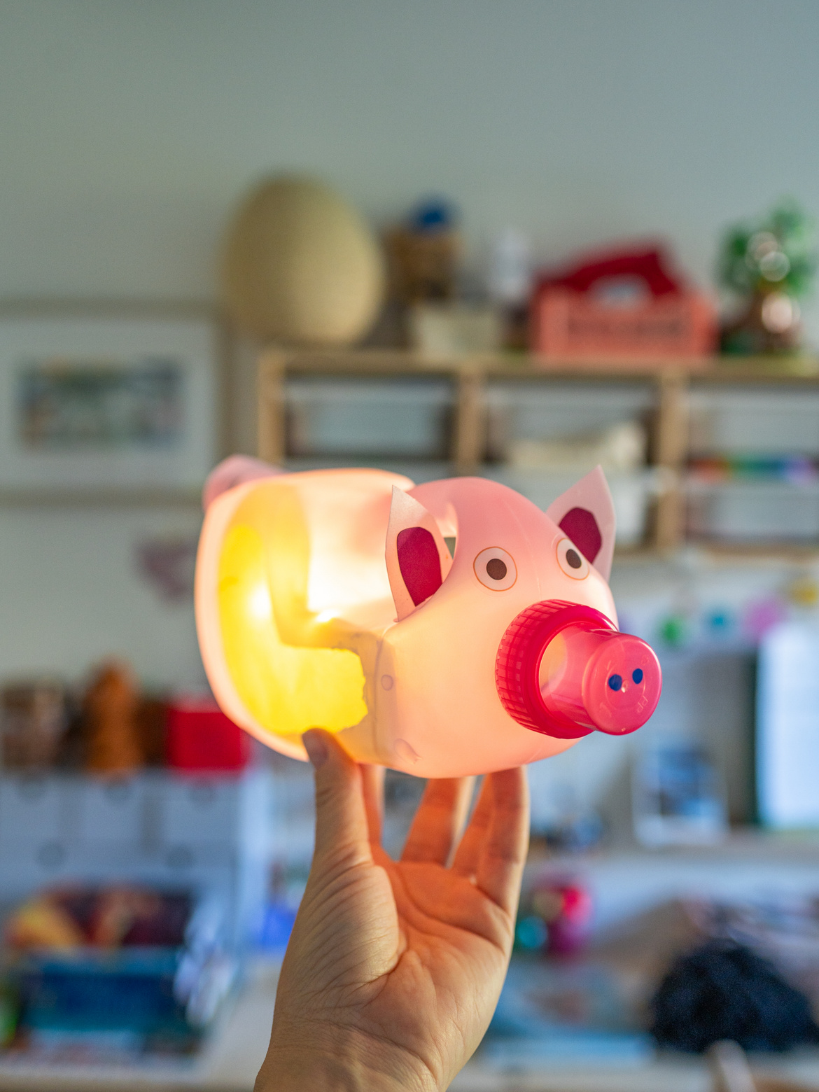 Für St. Martin könnt ihr einfach den Henkel der Flasche als Aufhängung benutzen. Da die Schweinchen-Laterne nicht nur niedlich aussieht, sondern auch ein gemütliches Licht verbreitet, kann sie uns in der kompletten dunklen Jahreszeit leuchten. Stellt sie auf den Fenstersims, den Tisch oder den Balkon und genießt die zauberhafte Atmosphäre.